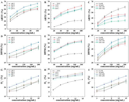 Antioxidant activities of the Pickering emulsion under different environmental stresses. (A–C) 2,2′-Azino-bis(3-ethylbenzothiazoline-6-sulfonate) (ABTS+) cations, (D–F) 2,2-diphenyl-1-picrylhydrazyl (DPPH), and (G–I) O2− anions of the Pickering emulsion under different pH, temperature, and salt concentration conditions.