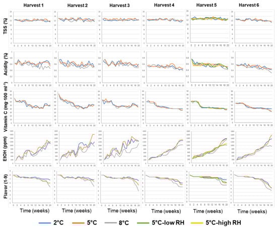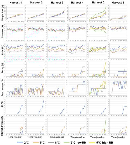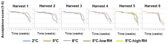 Overall, fruit-acceptance scores remained relatively high (acceptance score ≥ 4, on a scale of 1 to 5) for 14–19 weeks, depending on the various pre-harvest and postharvest features (Figure 4). It is worth noting that the fruits stored at 5 °C maintained high acceptance scores for longer periods when compared to the fruits stored at a lower temperature of 2 °C or a higher temperature of 8 °C.