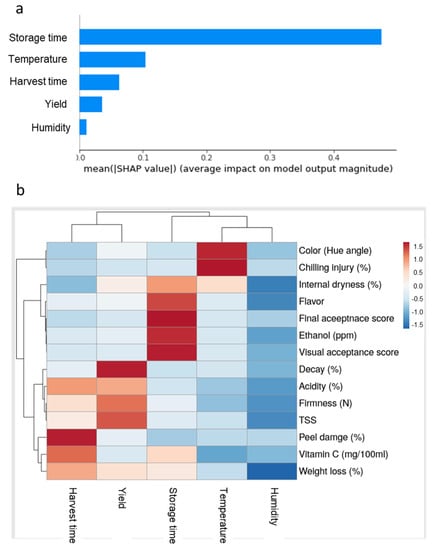 To evaluate the importance of the various pre-harvest and postharvest features on the quality of ‘Rustenburg’ navel oranges, we used various statistical analysis tools, including SHAP and RF MDA methods (Figure 5a,b). A feature importance analysis using mean SHAP values revealed that storage time was the most important feature affecting fruit quality, followed by storage temperature, harvest time, yield and humidity conditions (Figure 5a). Furthermore, RF MDA analysis revealed that harvest time had major effects on peel damage and vitamin C levels, and that orchard yield had major effects on decay, firmness and TSS. Regarding the postharvest features, storage time had major effects on ethanol accumulation, fruit flavor and acceptance scores; storage temperature had major effects on CI and peel color; humidity conditions during storage had a major effect on fruit weight loss (Figure 5b). It is worth noting that the different pre-harvest and postharvest features affected different postharvest quality parameters. For example, storage time mainly affected flavor, ethanol levels and acceptance scores, whereas storage temperature mainly affected color and CI (Figure 5b).