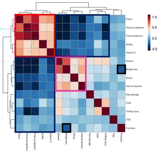 Pearson correlations between the various quality parameters revealed positive correlations among flavor, visual and final acceptance scores and acidity and vitamin C levels, as well as negative correlations between these attributes and changes in ethanol levels, weight loss, decay, internal dryness, peel damage, color and CI (Figure 6; red and blue boxes, respectively). We also observed positive correlations between ethanol content, decay, weight loss and internal dryness, as well as negative correlations between weight loss and firmness (Figure 6; pink and black boxes, respectively).