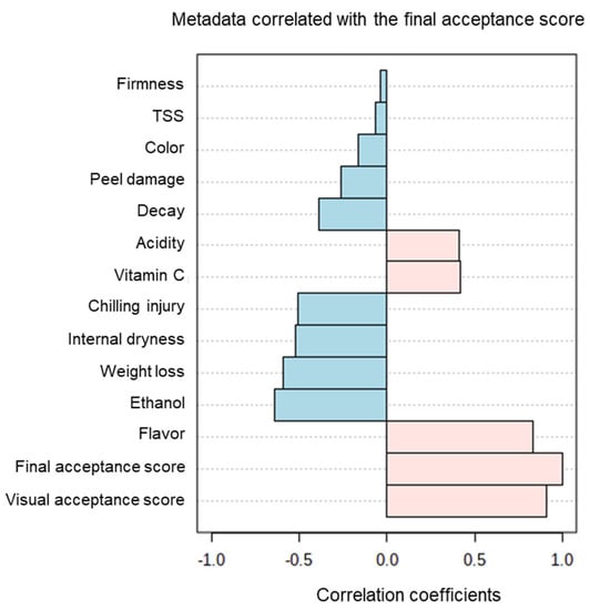 Finally, Pearson correlations revealed positive correlations between final acceptance scores and acidity, vitamin C, flavor and visual acceptance scores, and negative correlations between final acceptance scores and changes in TSS, firmness, color, peel damage, decay, CI, internal dryness, weight loss and ethanol accumulation (Figure 7).