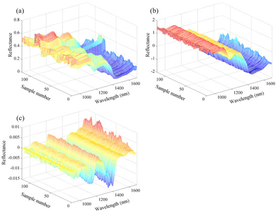 The obtained raw spectral information usually contains interference information, such as noise, which degrades the information quality. Therefore, spectral preprocessing is essential. Here, standard normal variate (SNV) and first derivative (1D) with Savitzky–Golay methods were used to preprocess the spectral signals. SNV is used to eliminate the interference caused by the size of solid particles, surface scattering and light range variations in acquired spectra [18]. 1D eliminates the baseline shift and separates broad and overlapping NIR bands in spectra without increasing the noise [19].
