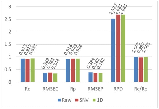 The performance of the developed PLSR models was assessed using the following parameters: the correlation coefficients for calibration (Rc) and prediction (Rp), root mean square errors for calibration (RMSEC) and prediction (RMSEP), and residual predictive deviation (RPD). In addition, the ratio of Rc to Rp was used to evaluate the stability and robustness of the proposed model.