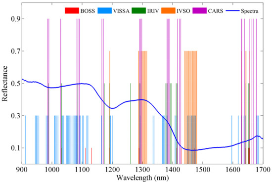 BOSS, VISSA, IRIV, IVSO and CARS were used to select characteristic wavelengths from the complete set of wavelengths, and the results are shown in Figure 4. In summary, 12, 65, 18, 27 and 23 characteristic wavelengths were selected by BOSS, VISSA, IRIV, IVSO and CARS, respectively. Wavelength selection significantly reduced the total number of spectral variables by 71.49–94.74%. These results show the advantages of dimensionality reduction, although different methods produced different results.