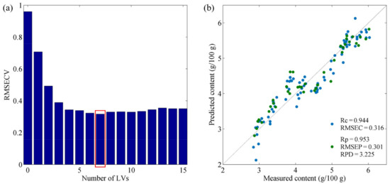Plots of the optimal IRIV–PLSR model: (a) selection of the optimal number of LVs, and (b) scatter plot of the IRIV–PLSR model for fat prediction.