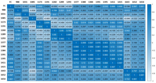 Heat map of the correlation coefficient between the selected characteristic wavelengths by IRIV and fat content.
