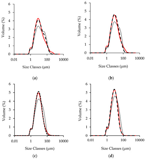 Sugar phases presented a different PSD (Supplementary Figure S1); D90 values were 1190 µm and 190 µm for saccharose and Lucuma powder, respectively. However, the refining phase started after hazelnut paste was obtained (fineness of hazelnut paste ≈ 350 µm with or without Lucuma powder). Figure 1 shows the PSD of spreadable creams refined for 60 (Figure 1a), 90 (Figure 1b), 120 (Figure 1c), and 150 (Figure 1d) min.