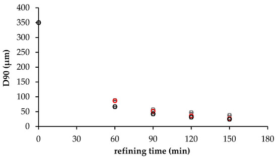 As refining proceeded, the range of size classes of solid particles varied from 0.52–859 to 0.52–211 μm for cream CBS, from 0.52–515 to 0.52–211 μm for cream OS, and from 0.52–586 to 0.52–211 μm for OLS cream. The CBS and OS creams showed remarkably similar unimodal distribution, as also reported in other studies for anhydrous pastes refined in a ball mill refiner [14,22,29], with some differences at high particle size which became less evident as refining proceeded. OLS cream showed a larger particle size distribution curve with a lower particles volume percentage of around 11 μm compared to the other samples. Moreover, the PSD of the OLS cream changed from bimodal to unimodal during refining, due to the presence of a multicomponent sugar phase. At particle sizes between 0.5–0.8 μm, a small left shoulder was observed for all the samples. Table S1 reports the percentiles of the PSD for creams analysed. D10 did not discriminate among creams and was not affected by refining time. D50 and D90 values decreased as refining proceeded for all the creams. Figure 2 reported the evolution of D90 as a function of refining time, where 350 µm corresponded to the fineness of the coarsest fraction of unrefined cream, that is hazelnut paste.