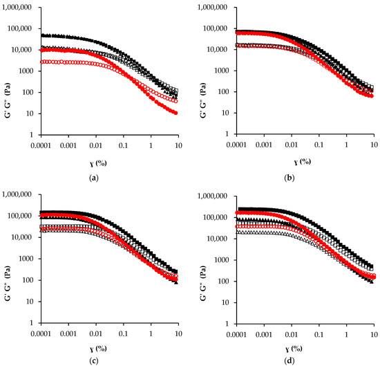 Results are reported as the mean ± standard error of at least three replications. Critical strain values (γ0) and yield stress (σ*) were determined from strain sweep curves. The critical strain was determined as the strain where G′ value decreased by more than 10% of the values recorded in the LVR, while the yield stress was defined as the stress where the viscous and elastic contributions were equal (G′ = G″) [30].