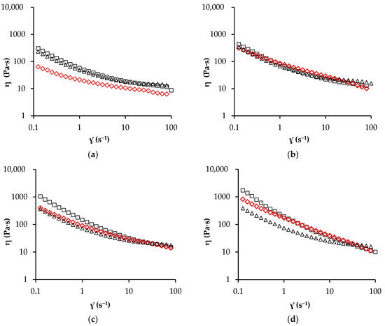 Knowledge of the apparent viscosity of a cream is crucial both in quality control of the product and in process application. The apparent viscosities of spreadable creams refined for various amounts of time are represented in Figure 4. All the spreads showed pseudo-plastic behaviour since the apparent viscosity (η) decreased as the shear rate () increased. The viscosity of CBS and OS creams increased as the refining time increased [17], meanwhile, for OLS cream, this behaviour was observed only moving from 60 (Figure 4a) to 90 min (Figure 4b) of refining time. After 120 min (Figure 4c), CBS and OLS creams showed remarkably similar viscosity curves, lower than that of OS cream. However, after 150 min (Figure 4d), OLS cream seemed to have the lowest viscosity values, indicating an effect of the Lucuma powder on this cream property, as also observed by Miele et al. (2020) [41] for RUTF formulations in which the oil/powder ratio was the same, but the sugar content was reduced, and the soy flour content increased. However, it is also true that at the end of the refining process, OLS cream presented a D90 higher than that of both CBS and OS creams.