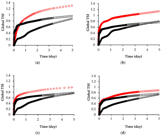 Turbiscan stability index (TSI) as function of storage time (day) for spreadable creams CBS (◇), OS (□) and OLS (Δ) refined for 60 (a), 90 (b), 120 (c) and 150 (d) min.