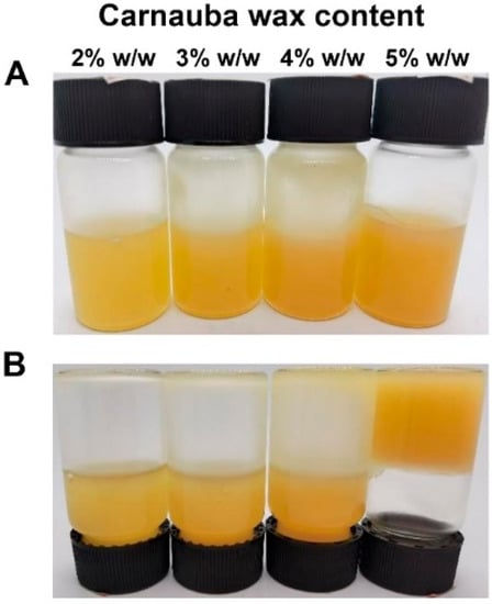 2.3. Preparation of Carnauba Wax-Based Oleogel