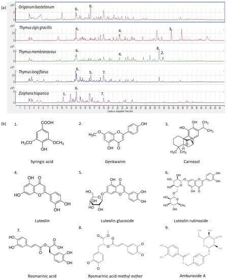 (a) Base Peak Chromatograms of MAP extracts with higher bioactivity obtained by HPLC-QTOF-MS; (b) chemical structure of some compounds identified in the selected extracts.