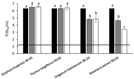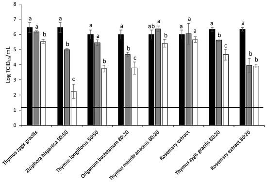 Reduction of hepatitis A virus (HAV) titers (log TCID50/mL) treated with different extracts after 37 °C/ON incubations. Black bars: Control; Grey bars: 0.5 mg/mL; White bars: 5 mg/mL. Each bar represents the average of triplicates. Within each column, different letters denote significant differences between treatments. Horizontal line depicts the detection limit.