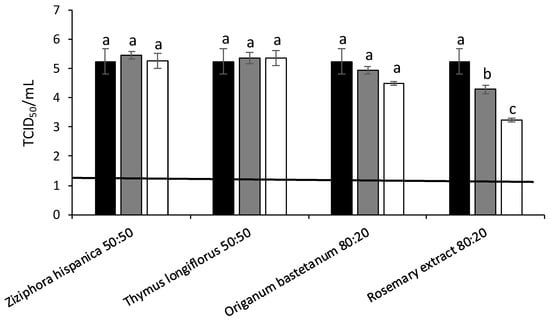 Reduction of feline calicivirus (FCV) titers (log TCID50/mL) treated with different extracts after 25 °C/ON incubations. Black bars: Control; Grey bars: 0.5 mg/mL; White bars: 5 mg/mL. Each bar represents the average of triplicates. Within each column, different letters denote significant differences between treatments. Horizontal line depicts the detection limit.