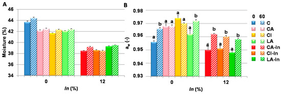 Moisture (A) and water activity (aw) (B) of the fresh and stored dough (−18 °C-60 days). Different letters indicate significant differences in the same formulation between 0 and 60 days (p < 0.05). Bars: mean ± standard deviation; (-) unitless parameter.