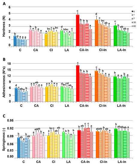 Textural parameters of doughs: Hardness (A), adhesiveness (B), and springiness (C) of the fresh and stored dough at −18 °C for 1, 7, 30 and 60 days. Different letters in the same formulation between 0 and 60 days of storage indicate significant differences (p < 0.05). Bars: mean ± standard deviation; (-): unitless parameter.