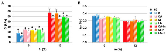 The value of G′ did not change during storage in the doughs without inulin. This parameter significantly decreased with the storage time in doughs containing carbonate and citrate and inulin (CA-In and CI-In), and remained unaltered in doughs with lactate (LA-In). This suggests a protective effect of lactate anion against matrix de-structuring. No significant differences were found in tan δ after storage for any of the doughs studied (Figure 3B), therefore freezing did not produce changes in dough viscoelasticity after storage for 60 days at −18 °C. Similar results were found in dough with strong breadmaking wheat flours [26].
