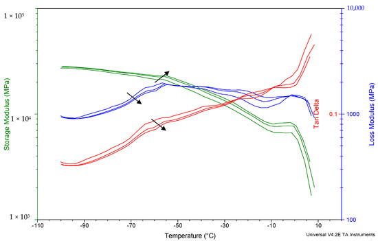 The thermomechanical properties of dough were studied by DMA analysis. Figure 4 shows the storage modulus (E′), loss modulus (E″) and tan δ of a typical thermogram obtained from a wheat dough. Four peaks in loss modulus (blue) and tan δ (red) curves were identified; each curve belongs to frequencies of 1, 5 and 10 Hz. Two higher peaks around −1 °C and −20 °C was observed, corresponding to the melting of ice and the start of ice melting, respectively [8]. The third peak, around—40 °C, corresponded to the α-relaxation (glass transition), while the lower temperature peak, at almost—60 °C, corresponds to a β-relaxation [9]. The temperatures of the different transitions increased with frequency. The frequency dependence behavior of transitions in bakery products using DMA has been reported in different studies [9,29].