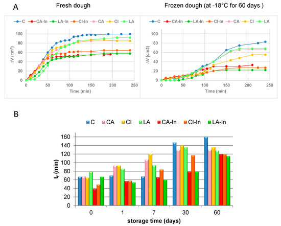 Figure 5B shows the optimal fermentation times (tf) obtained from the doughs previously frozen for 0, 1, 3, 7 and 60 days. In all formulations, the tf of thawed dough after they were frozen and stored at −18 °C increased with the time. This can be attributed to a lower production of CO2 resulting from a lower number of active yeasts and/or from a decrease in the ability of gluten to retain it [31,32]. Metabolites produced during yeast fermentation can alter the stability of frozen products. During storage, yeasts in frozen doughs can be affected by partially losing their fermentation capacity because of the physiological effects of frozen water on cells or of the concentration of certain fermentation metabolites [32].