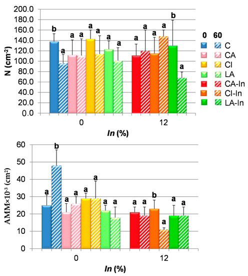 Crumb alveolate parameters: number of alveoli per area (N), mean area of alveoli (AMM) and air fraction (AT) of fresh and stored doughs at −18 °C for 60 days. Different letters in the same formulation indicate significant differences (p < 0.05). Bars: mean± standard deviation. Crumb and binary images of C0, C60, LA-In 0 and LA-In60 breads.