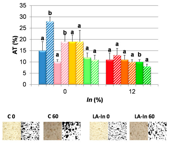 Control crumb presented a major amount of air (Figure 6, AT) and resulted in a high moisture; therefore, it is supposed to be softer, an effect that was not demonstrated. The structure of crumb is more aerated. CA crumbs arising from frozen dough presented higher AT, while crumbs from LA-In showed a lower AT and higher firmness. The images of crumbs of wheat bread (C) and with calcium lactate and inulin (LA-In) can be observed at the bottom of Figure 6. Samples containing calcium lactate were selected because the porosity of these crumbs changed with freezing dough.