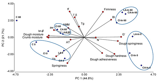PCA performed on fresh and frozen stored doughs explained 66.5% of the total variance (Figure 7). Principal component 1 (PC1) accounted 44.8% of the total variance and was associated to moisture, aw, tan δ and in the opposite direction hardness, elasticity and G′. On the other hand, PC2 was mainly related to baking quality parameters, such as fermentation time, browning index, firmness and the elasticity of crumbs, and also dough hardness and Tβ. In addition, samples were grouped according to the content or absence of inulin (0, In) and the freezing time (0, 60 days), and were independent of the type of calcium salt.
