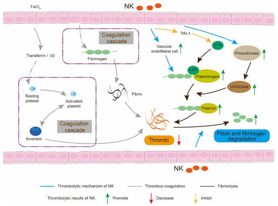 Thrombolytic mechanism of NK. NK not only degrades fibrin or dissolve thrombi directly, but also activates the body’s own thrombolytic system and inhibits its thrombi coagulation.