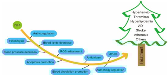 NK can inhibit coagulation, dissolve blood clots, reduce hypertension and hyperlipidemia, promote apoptosis, and regulate autophagy [134,135]. Therefore, NK is highly promising as a natural, safe, effective, and low-cost clinical agent or food supplement for the treatment or prevention of CVDs (Figure 3) [10,15].