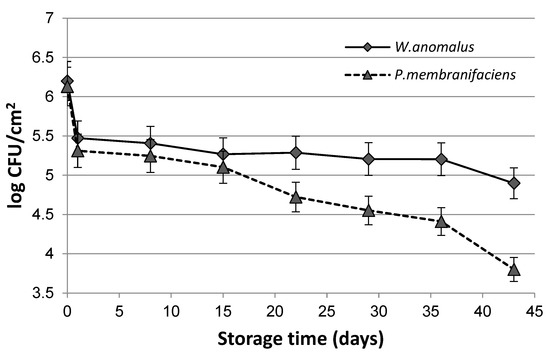 The composition of the biofilm should ensure the survival of antagonistic microorganisms and not negatively affect their antifungal activity during storage. The viabilities of W. anomalus and P. membranifaciens killer yeasts incorporated in the sodium alginate films were evaluated just after the biofilm was dried and every 7 days during storage periods of 28 days at 2 °C, and subsequently, 14 days at 22 °C. The survival of W. anomalus cells was higher than P. membranifaciens. The population of W. anomalus immobilized in the alginate film at the end of the storage remained above 75%, while that of P. membranifaciens was at about 60% (Figure 1).