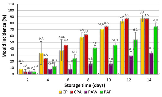 The effect of biofilms with W. anomalus or P. membranifaciens on the incidence of P. italicum on apple fruit. CP: fruit injured and inoculated with P. italicum; CPA: fruit injured and inoculated with P. italicum, coated with alginate; PAW: fruit injured and inoculated with P. italicum, coated with alginate containing W. anomalus; PAP: fruit injured and inoculated with P. italicum, coated with alginate containing P. membranifaciens. a–f: values with different superscript Roman letters (for each storage time) were significantly different (p < 0.05); A–C: values with different superscript Roman letters (for each treatment) were significantly different (p < 0.05).
