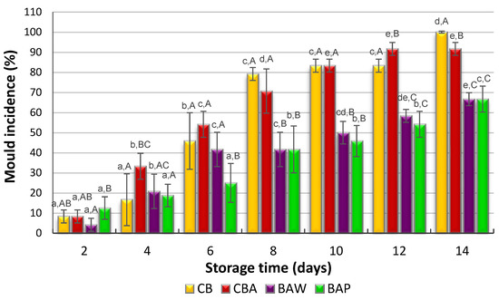 The effect of biofilms with W. anomalus or P. membranifaciens on the incidence of B. cinerea on apple fruit. CB: fruit injured and inoculated with B. cinerea; CBA: fruit injured and inoculated with B. cinerea, coated with alginate; BAW: fruit injured and inoculated with B. cinerea, coated with alginate containing W. anomalus; BAP: fruit injured and inoculated with B. cinerea, coated with alginate containing P. membranifaciens. a–e: values with different superscript Roman letters (for each storage time) were significantly different (p < 0.05); A–C: values with different superscript Roman letters (for each treatment) were significantly different (p < 0.05).
