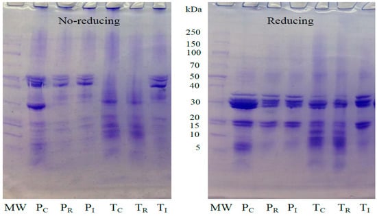 The molecular weight of the proteins from Thai and Peru SI oil press-cakes, residue after extraction of protein isolates, and protein isolates were determined by SDS-PAGE under reducing and non-reducing conditions. Figure 1 depicts the protein patterns of the Thai and Peru SI proteins. The major protein components in the Peru SI oil press-cakes (PC) had molecular weights (MW) of 30, 40, and 50 kDa under non-reducing conditions. The reducing conditions revealed that the MW of protein bands was in the 40–50 kDa range, while the intense bands at 20 and 30 kDa were clearly visible. This additional intensity of protein bands might be caused by the disulfide bonds in the structure of the Thai and Peru SI protein isolates because of the reducing agent, allowing the protein sub-units to unfold as detected in lower MW units.