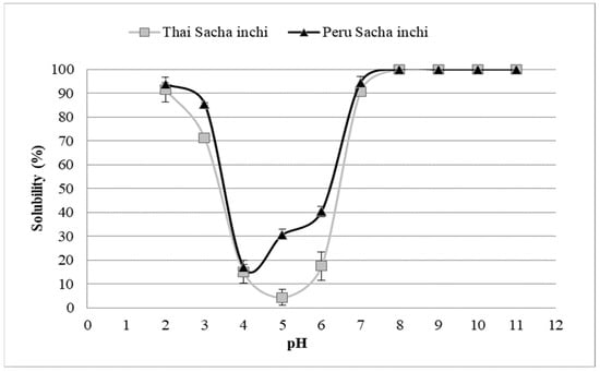 The solubility results of the protein isolates from the oil press-cakes of Thai and Peru Sacha inchi are present in Figure 2. The results show that the solubility of the protein isolates increased as a function of pH. At a pH of 5.0, the protein in the Thai SI showed minimum solubility, while the Peru SI protein isolate had less ability to solubilize at a pH of 4.0, being near to the isoelectric point (pH~4.5). However, both protein isolates markedly increased their solubility below or above the pH range of 4–6. The maximum solubility (100%) of these proteins was obviously found at a pH of ~8.0 for both the Thai and Peru SI samples. The maximum solubility could be due to more hydrophilic linkages of the protein molecules with lower hydrophobicity to achieve higher solubility [29]. On the other hand, the Thai SI sample has the lowest solubility value and aggregation occurs at a pH of 4.5 to 5. The greater the pH value’s distance from pI, the more positive and negative charges appeared on the surface of the protein molecule. Hydrophilic and hydration repulsion forces could overcome the hydrophobic interaction, allowing proteins to remain highly soluble [6]. According to the solubility profiles, protein isolates may be applied in food products with a wider range of pH than quinoa protein isolate [30] and chia seed protein isolate [31], which have lower solubility.