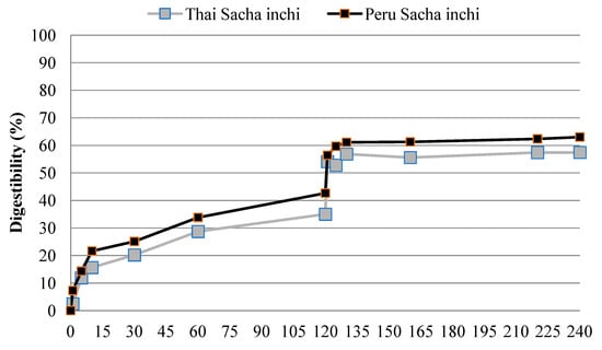 The in vitro digestibility of protein isolate samples was investigated by a sequential pepsin–trypsin digestion process, as shown in Figure 3. The simulated pepsin digestion was able to release nitrogen, as evidenced by the increased digestibility of Peru SI protein isolate up to 21.62% between 0 and 10 min of digestion time. Meanwhile, the Thai SI protein isolate demonstrated 15.66% digestibility between 0 and 10 min of digestion time. The pepsin digestion process proceeded for 120 min to attain a digestibility of 42.64% in the Peru SI sample. Similarly, the Thai SI sample demonstrated 34.99% digestibility at 120 min of digestion time. Thereafter, digestion by trypsin enhanced the protein digestibility, estimated to be 59.65% and 52.41 in the Peru and Thai SI samples at 120 min, respectively. The digestibility of the Peru and Thai SI protein isolates was in the range of 55–60% after 120 min of digestion time. The results show that the digestibility of these Thai SI protein isolates was relatively lower than the Peru SI at 10–120 min of digestion time during the simulated pepsin–trypsin digestion process (p < 0.05). A similar trend was observed in the percent digestibility of the Thai and Peru SI protein isolate samples at 120 min of digestion time. The digestibility of SI protein concentrate by trypsin was reported to increase at 121–130 min of digestion, and it continued to show incremental increases greater than 50% during the 120 to 240 min period of digesting time [15]. Chirinos, et al. [51] reported that sequential hydrolysis of SI with alcalase–neutrase enzymes did not affect the bioactivity of hydrolyzed SI in terms of antioxidant and antihypertensive properties.