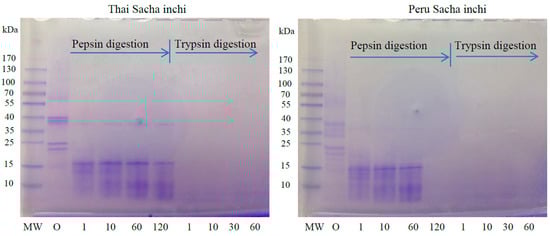 Sigma Chemical Co. provided trypsin (from bovine pancreas), pepsin (from porcine gastric mucosa), dithiothreitol (DTT), and Sigma marker wide range (St. Louis, MO, USA). Fluka Chemica-Biochemika supplied the sodium dodecyl sulfate (SDS) (Buchs, Switzerland). Merck supplied tris-hydroxymethyl aminomethane and Coomassie Brilliant Blue R-250 (Darmstadt, Germany). RDTH (Carl Roth GmbH+ Co. KG, Karlsruhe, Germany) provided the albumin fraction V, Roti-Blue protein assay kit, and Roti-PAGE Gradient (4–20 percent) ready-to-use polyacrylamide gel. Thai Rubber Land and Plantation Co., Ltd. provided Thai Sacha inchi (T) press-cakes (62.62% protein, Chiang Rai, Thailand). The company Agroin-dustrias Osho S.A.C. provided Peru Sacha inchi (P) press-cakes (56.92% protein, Lima, Peru). The oil pressing residue was dried, milled, and sifted. This end-product was named Sacha inchi flour, whereas the residue after cold pressing was called press-cake. The SI flour samples were collected, air-dried at 60 °C for overnight, ground into fine powder, and kept at −20 °C until used for analyses.