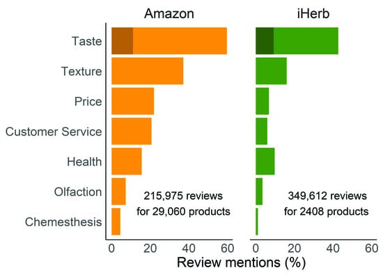 We collected over 200,000 reviews of ~30,000 food products on Amazon and ~350,000 reviews of ~2400 food products on iHerb. The Amazon reviews set was previously analyzed by Reed et al. [27]. Here, we scraped additional product information from Amazon.com. The iHerb dataset was created by scraping products and reviews under the “grocery” category of iHerb.com. We found that “taste” and “texture” related words were the most common in both datasets (Figure 1). Following those, price and customer service are mentioned with the same frequency on Amazon, followed by health (22%, 22%, and 14%, respectively), while in iHerb, words relating to health (10%) are more common than those relating to price (7%) and customer service (6%). Sweetness is the most frequently mentioned taste modality (13.32% in Amazon and 9.41% in iHerb) and is more common than words relating to olfaction and chemesthesis in both datasets, and more than price and customer service in the iHerb dataset (the words used in the search are detailed in Section 2.2).