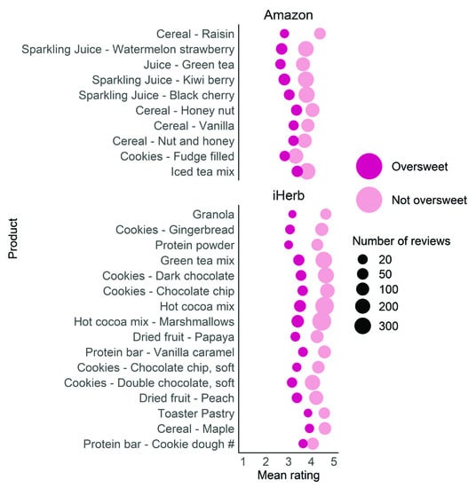 Specifically, we set out to examine whether “oversweet” mentions are linked to diminished product liking. All products with over 50 reviews and at least 10% “oversweet” reviews from both sources (10 in Amazon, 18 in iHerb) were analyzed. Some of the iHerb reviews were deleted from iHerb.com between the initial scraping and the time of analysis (last accessed on 22 June 2022), which resulted in the elimination of one of the products by said criteria, leaving 26 products in total.