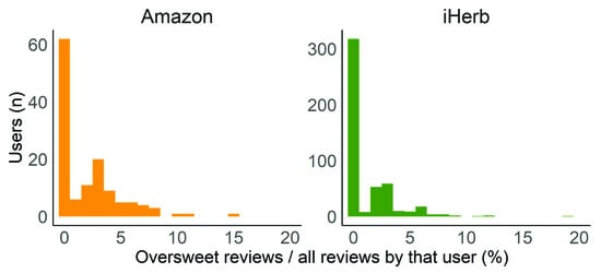 To establish whether the same group of people generally tend to review products as oversweet, we tallied the number of customers who posted over 30 reviews. The average ratio of oversweet reviews per reviewer is 2.1 ± 2.7 for Amazon customers and 1.3 ± 2.2 for iHerb customers. The vast majority of customers never complained about oversweetness, and only 3/128 Amazon customers and 4/492 iHerb customers submitted over 10% oversweet reviews. This indicates that oversweetness perception is not due to a few consumers complaining about multiple products but is rather derived from a non-negligible number of customers reacting in a product-dependent manner (Figure 3).