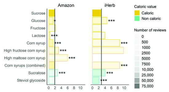 Interestingly, all but two products in Figure 2 contain caloric sweeteners, with eighteen of them containing sucrose. We next set out to find which sweeteners tend to appear in more “oversweet” reviews than others, analyzing all 215,975 reviews from Amazon and 349,612 reviews from iHerb.