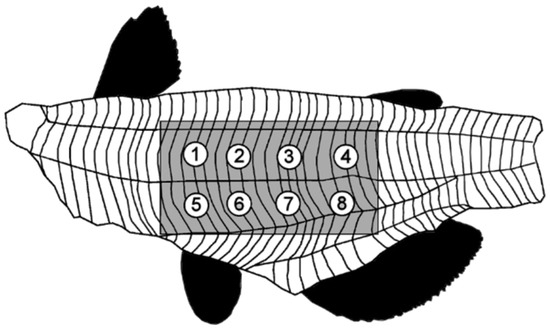 Positions 1−8 on fillet used for texture profile analysis. Shaded area was removed from the fillet before cooking [26].