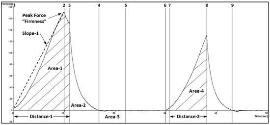 Parameters for texture analysis were: texture profile analysis sequence of two compressions, 30 kg load cell, ½” diameter ball probe (TA-18), 5 g trigger force, 50% strain, 3mm/s pre-test speed, 1 mm/s test speed, 1 mm/s post-test speed, 5 s pause time between cycles. Eight positions (four on the dorsal side and four on the ventral side of the lateral line, 1.8 cm apart, as seen in Figure 1) on each fillet were tested. Force−time graphs (Figure 2) for each test point were analyzed with Exponent 32 software (Stable Micro Systems, Surrey, UK) using a self-written macro that determined the thickness of the fillet before and after compression, the maximum force of both compressions, the compression upstroke and downstroke energy, or work, as measured by area. Seven texture attributes and fillet thickness were calculated by the formulas provided in Table 1.