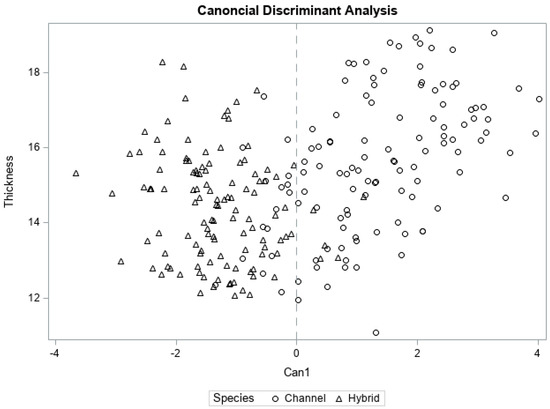 Group separation of channel and hybrid catfish fillets (n = 119) by TPA attributes. Because the variable catfish−type had two levels (channel and hybrid), the canonical discriminant analysis resulted in one canonical dimension (Can1) which accounts for 80% of the total variance explaining overall treatment differences.