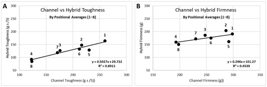 Data representation for parameters (channel vs hybrid) by positional averages for (A) toughness: Pearson’s correlation coefficient (r) = 0.94; and (B) firmness: correlation not significant.