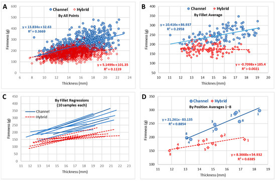 Data representation possibilities for attributes (thickness vs firmness). (A) All data points: Pearson’s correlation coefficient (r) = 0.61 for Channel, and r = 0.33 for Hybid; (B) Fillet averages: r = 0.54 for Channel, and no significant correlation for Hybrid; (C), Fillet 8-point regressions; (D) Position averages: r = 0.94 for Channel and r = 0.80 for Hybrid.