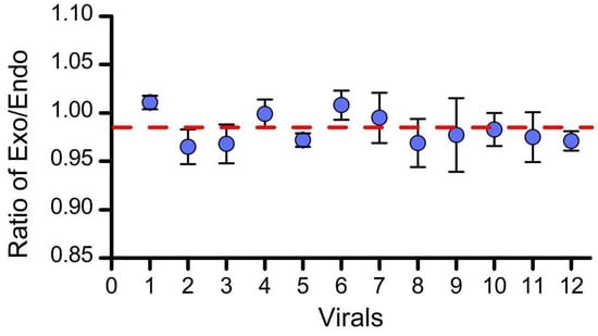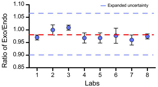 The certified copy number ratio value was 0.98 copy/copy, with an expanded uncertainty of 0.08 copy/copy (Figure 3). Measurement uncertainty is a parameter that characterizes the dispersion of measurement results. The genomic or matrix DNA reference material based on digital PCR quantitative technology has a measurement uncertainty level of approximately 10% [,]. The expanded uncertainty of this paper is 8%, demonstrating a high level of nucleic acid measurement.