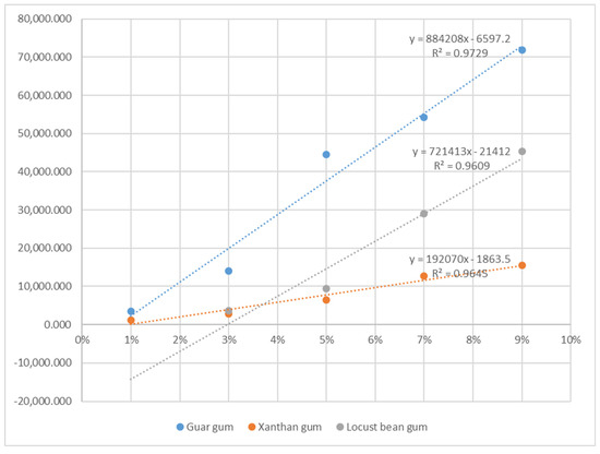 Based on these results, the linear regression equation evaluated for guar gum is ‘Y = 884,208X − 6597.2’ (where X is the concentration of guar gum, and Y is the hardness of sea buckthorn jelly). Moreover, the linear regression equations evaluated for each xanthan gum and locust bean gum are ‘Y = 721,413X − 21,412’ (where X is the concentration of xanthan gum and Y is the hardness of sea buckthorn jelly) and ‘Y = 192,070X − 1863.5’ (where X is the concentration of locust bean gum and Y is the hardness of sea buckthorn jelly). As can be seen from Figure 1, 3.008% of guar gum, 5.740% of xanthan gum, and 11.383% of locust bean gum have hardness that can be chewed with the tongue of the elderly. In addition, at guar gum 3.234 to 6.401%, xanthan gum 6.018 to 9.900% and locust bean gum 12.424 to 27.002% are added, and sea buckthorn jelly has a hardness that can be chewed with gum of the elderly. Moreover, 6.966% of guar gum, 10.592% of xanthan gum, and 29.606% of locust bean gum have a level of hardness that can be chewed with teeth.