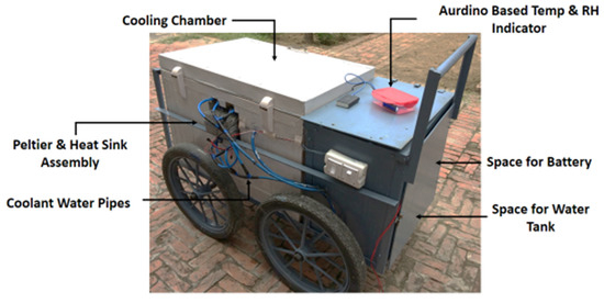 A battery-operated thermoelectric refrigeration system of 0.3 KW capacity was developed in the workshop of Punjab Agricultural University, Ludhiana. The cooling chamber of 100-L storage capacity (80 × 50 × 50 cm) was designed with a 6-cm thickness and the inside volume of the chamber was reduced to 100 L by partitioning. The main components of the developed thermoelectric refrigeration system include the cooling chamber, Peltier and heat sink assembly, coolant water pipes, coolant water storage tank, 12 V DC fan, fogger, temperature, and relative humidity indicator, as shown in Figure 1. Since the Peltier module required a DC, just as other electric appliances were operated on a DC, a 12 V electric battery was used in the system, and since the refrigerator was operated continuously, the battery was connected to the inverter for continuously recharging.