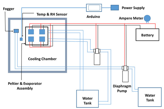 The assembly of the liquid-cooled thermoelectric refrigeration system consisted of four thermoelectric modules (TEC 12706 A), four aluminum liquid cooling heat sink blocks, and an elastomeric nitrile rubber sheet for insulation and two axial fans (12 V DC, 0.23 A). Two fin-type air-cooled heat sinks were assembled together facing side to side by riveting to make one heat sink of 20 × 15 × 8 cm. The cold sides of all (four) Peltier modules were pasted onto the cold side heat sink using thermal paste. Thermal paste is made of a polymerized liquid matrix of silicone of high thermal conductivity, which maintains a positive heat sink seal, facilitating efficient heat transfer from the electronic components to the heat sink. The hot side of each Peltier module was attached with a liquid-cooled sink. The clearance between the cold side and the hot side heat sinks was sealed using a 3-mm-thick elastomeric nitrile rubber insulation sheet, which presents the migration of heat from the hot side heat sink to the cold side heat sink. The inlet and outlet of all heat sinks were connected in parallel to the water tank through a plastic pipe of 1-cm diameter. Normal water was used as a coolant and circulated through evaporators using a diaphragm pump (12 V DC) powered by an electric battery. One fin-type air-cooled heat sink was attached over the liquid-cooled heat sink blocks, which supports the blocks as well as acts as an additional heat dissipation medium. The geometry of the liquid-cooled heat sink, connecting pipes, diaphragm pump, water tank, and the battery is shown in Figure 2.