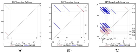 Diffogram showing the effect of storage condition and crop on the average daily change of PLW. (A) PLW comparison for storage (B) PLW comparison for crop (C) PLW comparison for storage*crop (S1—LCTR; S2—VCR; S3—ambient storage; C1—bitter gourd; C2—okra; C3—mango; C4—papaya).